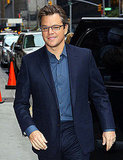 Matt Damon stopped by to chat with David Letterman and promote Hereafter on The Late Show yesterday. They touched on the film, but the interview was more about Matt's always-charming personality as he spoke glowingly about his family and how excited he is to welcome another girl with his and Luciana's upcoming new addition. Matt has said in the past that Luciana is done with being pregnant, and last night he revealed the baby could come any day now. Matt relayed a funny story about getting trapped in a corn maze while at a pumpkin patch recently as the Damons get into the Halloween spirit in NYC. When Dave brought up Ben Affleck's recent success with The Town, Matt joked that he's relegated to asking his old buddy for jobs these days. As usual, Matt was a crowd pleaser, so he ended the segment with one of his famous impressions of Matthew McConaughey. This time the spoof got a little X-rated when he suggested that after taking off their shirts they email out some photos of their genitalia, perhaps in reference to Brett Favre's recent scandal.